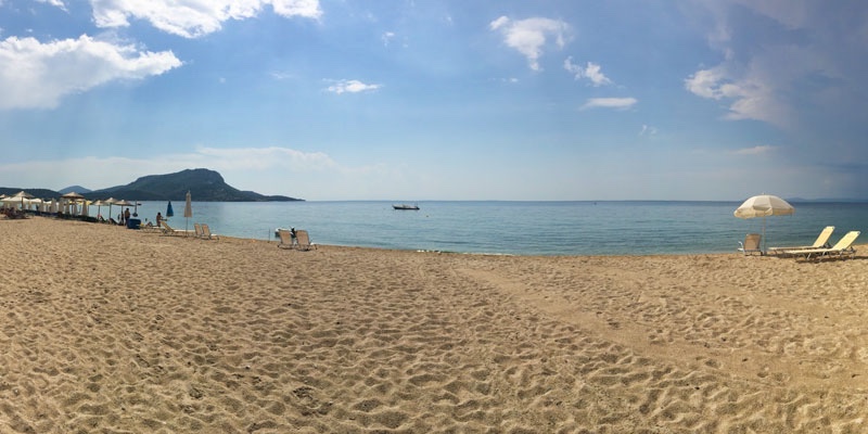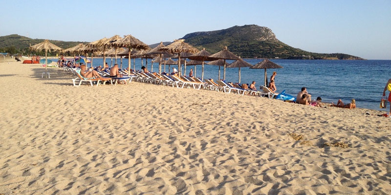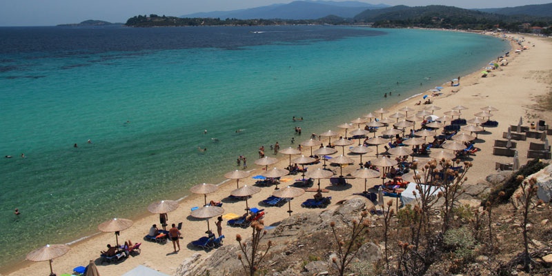 Добре организиран и развит. Един от най-дългите и широки плажове на Халкидики. Страхотна гледка към връх Атон.