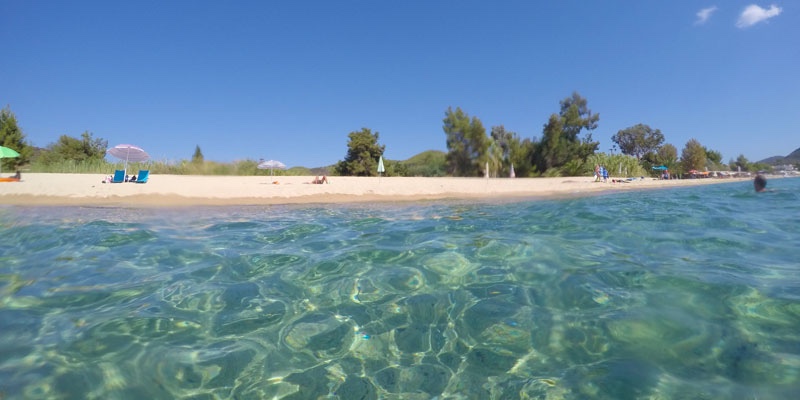Плажът е много плитък – като голям, защитен басейн. Пясъкът е прахообразен и мек, и не може да се сравни с никой друг на Ситония. Може да влезете на над 50+ метра навътре и водата няма да в стигне и до кръста, така че е идеалният детски басейн. Този плаж е пртъпкан дори в края на сезона, така че е добре да отидете рано, ако искате да паркирате и да си намерите място за хавлията.