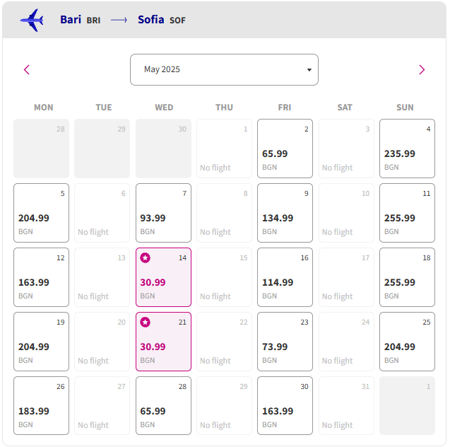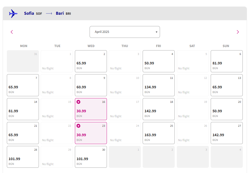 Wizz Air предлага изключително изгодни полети от София до Бари през април 2025 г., с цени, започващи от 30,99 лв. в посока. Промоционалните дати за заминаване от София са 16 и 23 април, а за връщане от Бари – 30 април (36,99 лв.), както и 14 и 21 май (30,99 лв.).