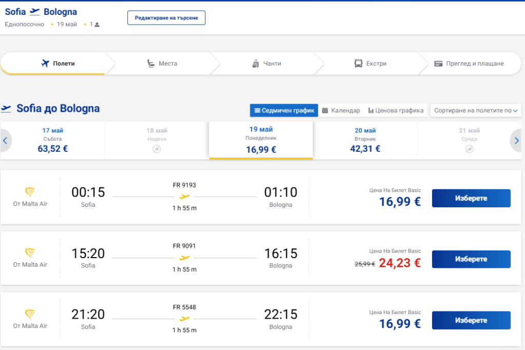 - 19 май: София – Болоня (с Ryanair) на цени от 16.99 евро в посока