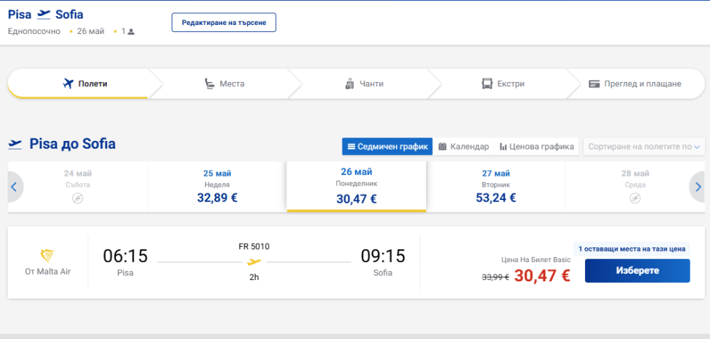 - 26 май: Пиза – София (с Ryanair) на цени от 30,47 евро в посока